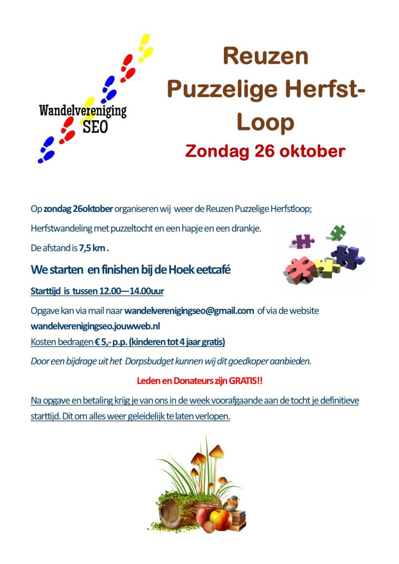 Op zondag 26 oktober a.s. organiseren we weer onze herfstwandeling; De Reuzenpuzzelige Herfstloop, een wandel puzzeltocht van 7,5 km.